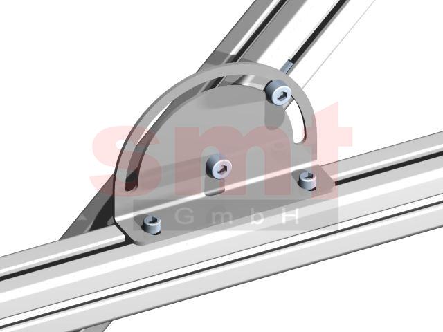 Drehwinkel 130 für Profile im Raster 40/45/50 werden zur Verbindung zweier Profile verwendet, die an ihren Seitenflächen anliegen und unter einem beliebigen Winkel zueinander stehen. Zur Befestigung in der Baureihe 8 im Raster 40 werden je 2 Schrauben S208SIK616 und S208NSMS6 sowie je 2 Schrauben S208SIK816 und S208NSMS8 benötigt. Im Schwenkbereich kann beispielsweise auch ein Klemmhebel mit Gewinde M8 verwendet werden