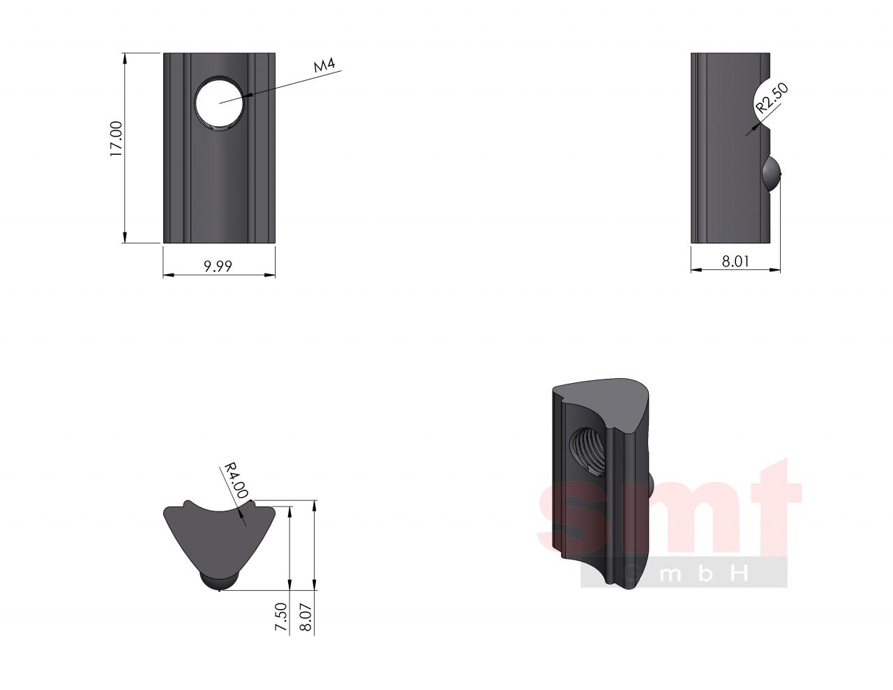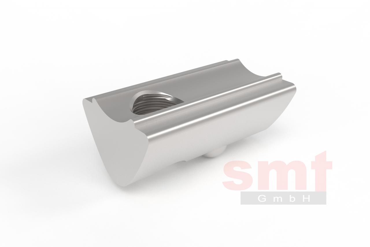 Nutenstein 6, mit Steg, M5Hinweis Halbrund-Nutensteine mit Absatz sind universelle Befestigungselemente mit unterschiedlichen Gewindegrößen, die sich durch Ihre Formgebung an beliebiger Stelle in die Profilnut einschwenken lassen und nicht stirnseitig eingeschoben werden müssen. Durch ihre federgelagerte Kugel drücken Halbrund-Nutensteine auf den Nutgrund und halten dadurch die gewünschte Position. Der Absatz ist so ausgelegt, dass dieser zwischen den beiden Nutöffnungen geklemmt und dadurch der Halbrund-Nutenstein gegen Verdrehung gesichert wird, welches das Eindrehen einer Schraube in das Innengewinde wesentlich vereinfacht. Handelsübliche Ausführungen sind Stahl verzinkt oder Edelstahl, wobei Kugel und Feder grundsätzlich aus Edelstahl bestehen Technische Daten Werkstoff: ST verzinkt Gewicht: 0,005 Kg Artikel Bezeichnung: Nutenstein 6, mit Steg, M5 Artikelnummer: S206NSMS5 Kompatibilität: I-Typ Download Datenblatt BarcodePreise Nutenstein 6, mit Steg, M5 Bitte wählen: